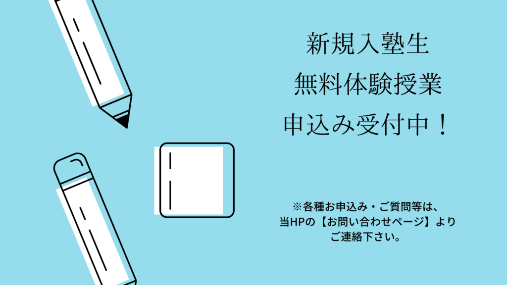 「皆さんが塾へ通う理由は何ですか?」 何のために、頑張って勉強しようと思っていますか? 「成績を上げたい!」「学校のテストで良い点数を取りたい!」「苦手科目を克服したい!」「志望校に合格したい!」 ・・・など、皆さんそれぞれに理由があると思 […]